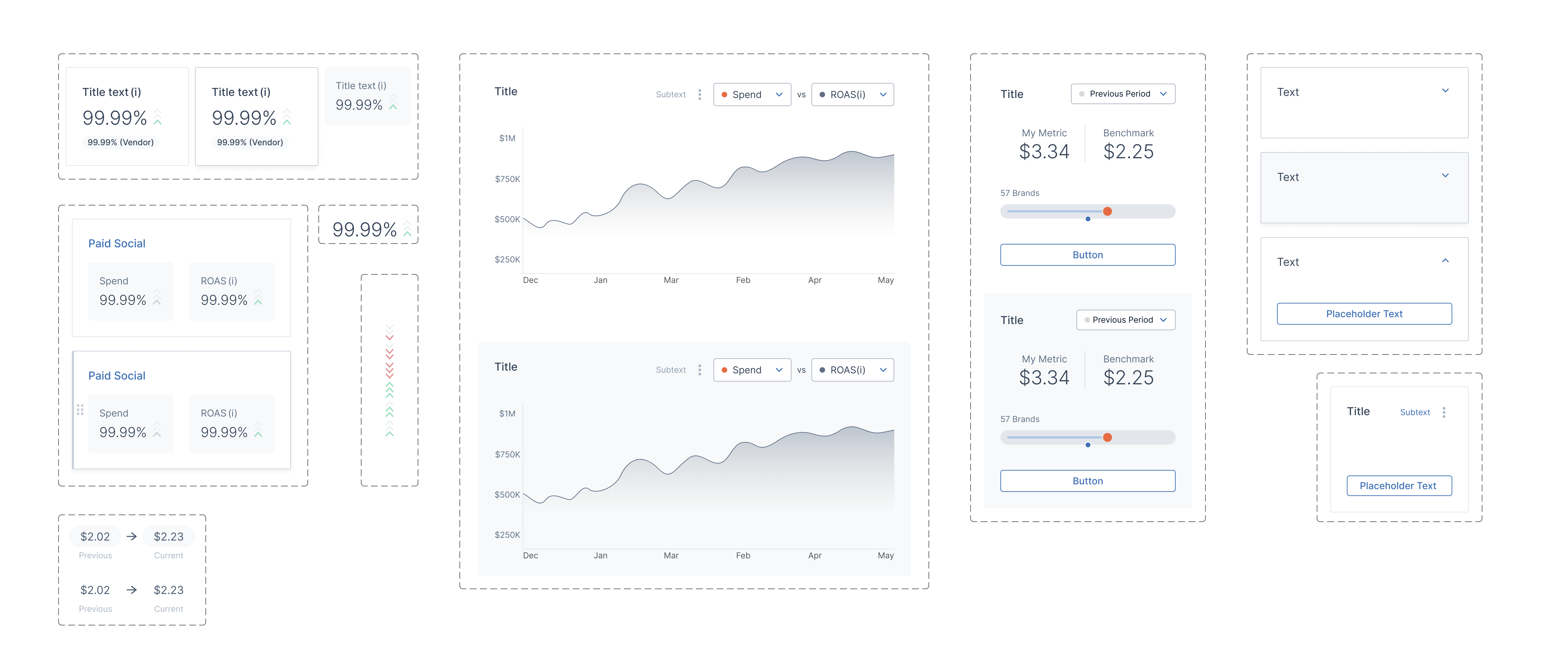 One of the largest part of the new dashboard was the updated tiles for different metrics. This resulted on these tile components. I started with the smallest part that constantly appeared, which was the stacked chevron, a new icon introduced in the redesign. This chevron was used throughout the new dashboard design, and will be continued to be used throughout the rest of the platform as the new UI continues to be implemented as a way to show the extent of growth or diminish. From there, I made the metric component, which was the number and chevron combined, also used throughout the dashboard on its own. I then made the metric tile component, with a title text, metric, and an option for a vendor comparison number under the metric. Finally, I made the channel/tactic tile, showcasing the spend and ROAS of channels and tactics.